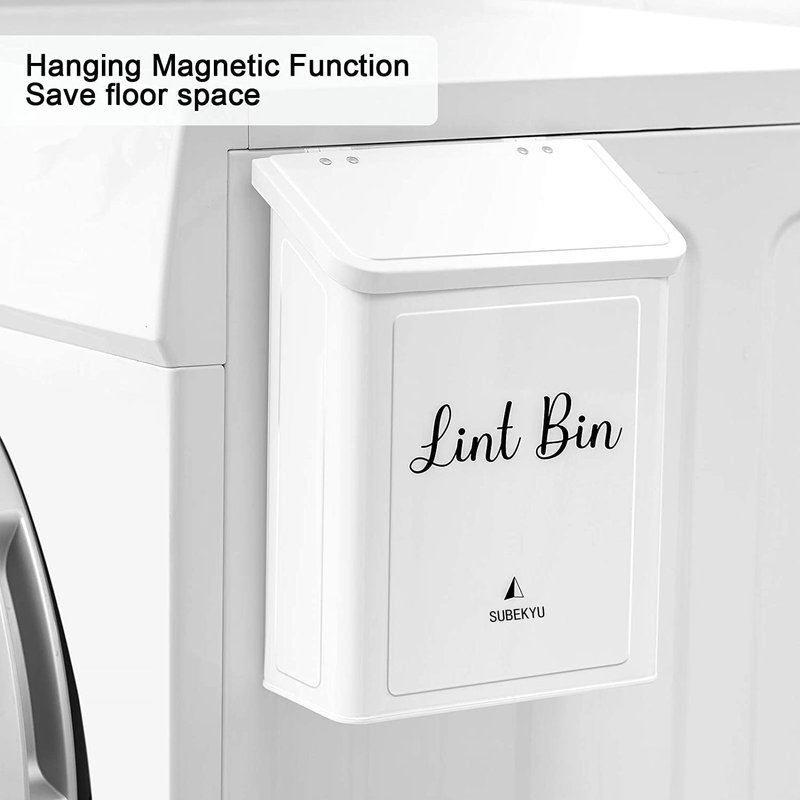 SUBEKYU Metal Magnetic Lint Bin for Laundry Room, Wall Mounted Lint Box Holder Trash Can with Lid for Dryer,Lint Basket for Laundry Room,White