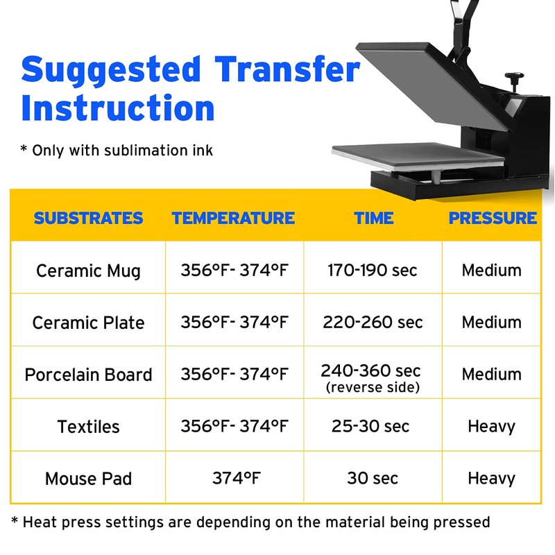 - 【EASY TO USE】- Print the image using inkjet printer with sublimation ink. Choose “Mirror Printing” setting, print on the white side. Set the temperature and time. Put the printed image face to the item you want to transfer, After the pressing process finished, peel the transfer paper. Imagine you can create your own design at home in LESS THAN 10 Min