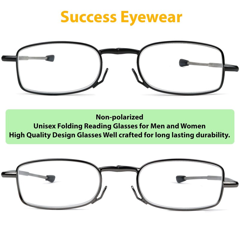 Success Eyewear brings you this great set of folding reading glasses. Set includes 2 pairs for your convenience in two popular colors: black and gunmetal. Keep a pair in your favorite reading spots so you always have one handy.