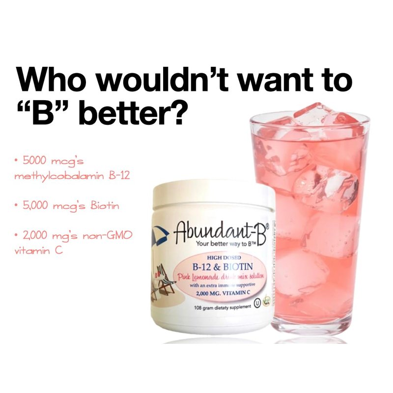 Now you can enjoy a winning high-dosed combination of flavor and function with Abundant-B! We've wrapped up 5,000 mcg's of methyl B-12 and 5,000 mcg's of Biotin plus our prized, high dosed vitamin C into a winning pink lemonade drink mix solution... because there just needed to be a better, more delicious way to B! Fight fatigue and what that represents and strengthen your immune system forcefully and flavorfully with Abundant-B because... like with all things, you can't always judge a book by it's refreshing, delicious, pink cover! ----------------------------------------------------------- Why B-12? Without enough red blood cells, your tissues and organs don’t get the oxygen they need resulting in anemia and and a feeling of fatigue. This applies to your gut as well since a lack of oxygen here will lead to daunting digestive issues. Why Biotin? You'll need biotin in order to produce keratin, a protein that promotes strong nails and hair for which it is famously known, but it has another claim to fame in which you might not be aware... Biotin can help regulate the bad fats in your blood too.. Our refreshing Abundant-B offers all this support effortlessly and deliciously! Cheers to you and our brand new pink lemonade drink mix solution! Oh and yes... we added our prized vitamin C too of course which also contributes to supporting lowered LDL as well!! Our Sufficient C LLC family of drink mixes allows you the convenience of mixing our drink mixes together if you would like to combine the flavors and functions of our unique drink mixes. Check it out and "C" for yourself!