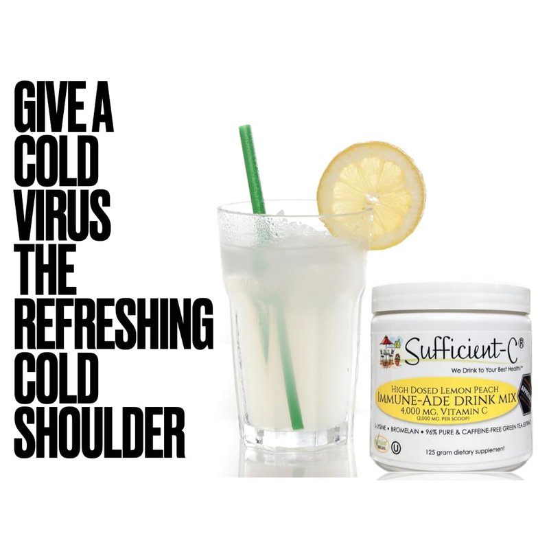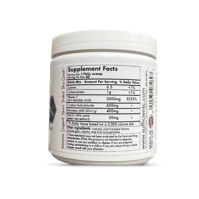 Sufficient-C High Dose Non-GMO Vitamin C Lemon Peach Immune-Ade Drink Mix, Convenient 125 Gram Size w/L-lysine, Bromelain & a Premium 96% Pure Green Tea Extract - Stomach Friendly, Adrenal Supportive
