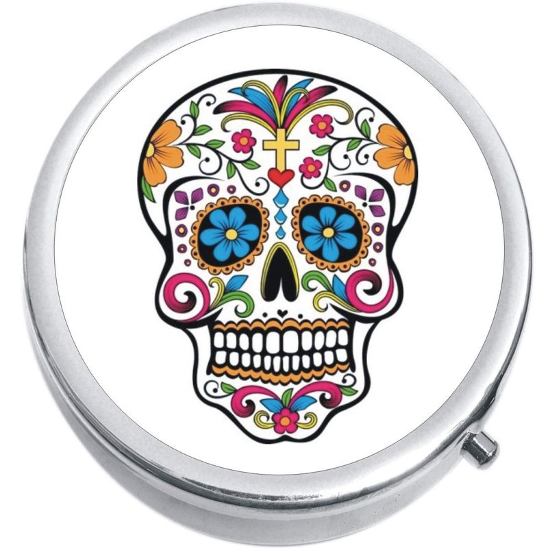 Sugar Skull Medicine Vitamin Compact Pill Box - Portable Pillbox case fits in Purse or Pocket