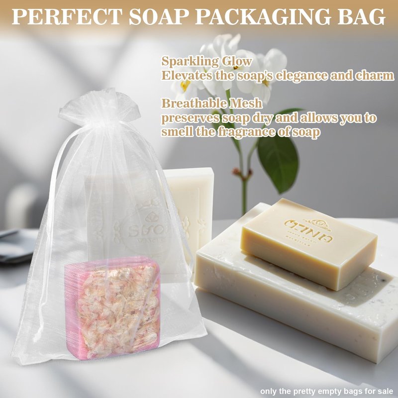 - Soap Display Bags for Small Business: Elevate your products with a unique touch by packaging your handmade soaps in elegant organza bags.Incorporating unique brand embellishments onto the soap packaging adds a distinctive flair, enhancing their appeal to attract customers