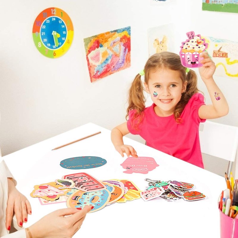 - 🎁SUPER-CUTE PATTERNS TO CHOOSE - Our cards feature 10 different yummy patterns like Cakes, Doughnuts, Ice-creams, Hamburger, French fries etc.. Each card matches the related pendant gifts and removable temporary tattoo, safe for kids without any bad smell. A sweet note is sure to brighten someones day and often means more than candy.