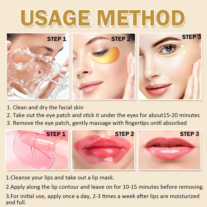 - Easy To Use Lip Mask:After cleaning lips and eyes, open the package, take out the eye or lip mask, apply it on eyes or lips, stay for 15-20 minutes (preferably lying down) until completely absorbed, gently massage the skin around eyes, no need to rinse. (Use with the notched side facing outward and the smooth side next to your mouth)