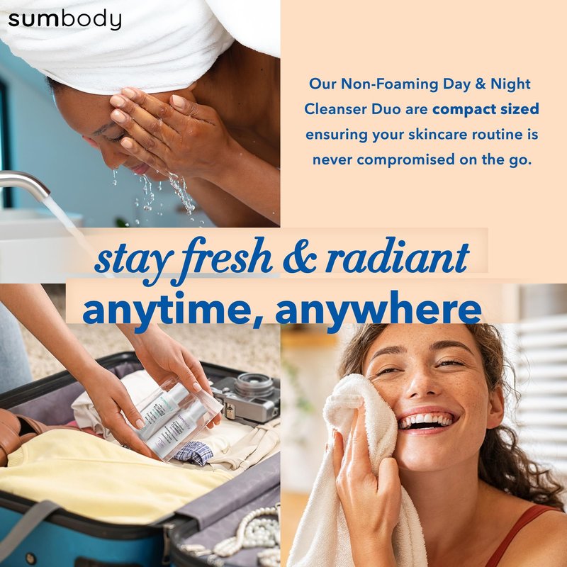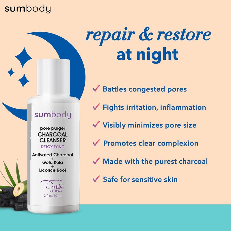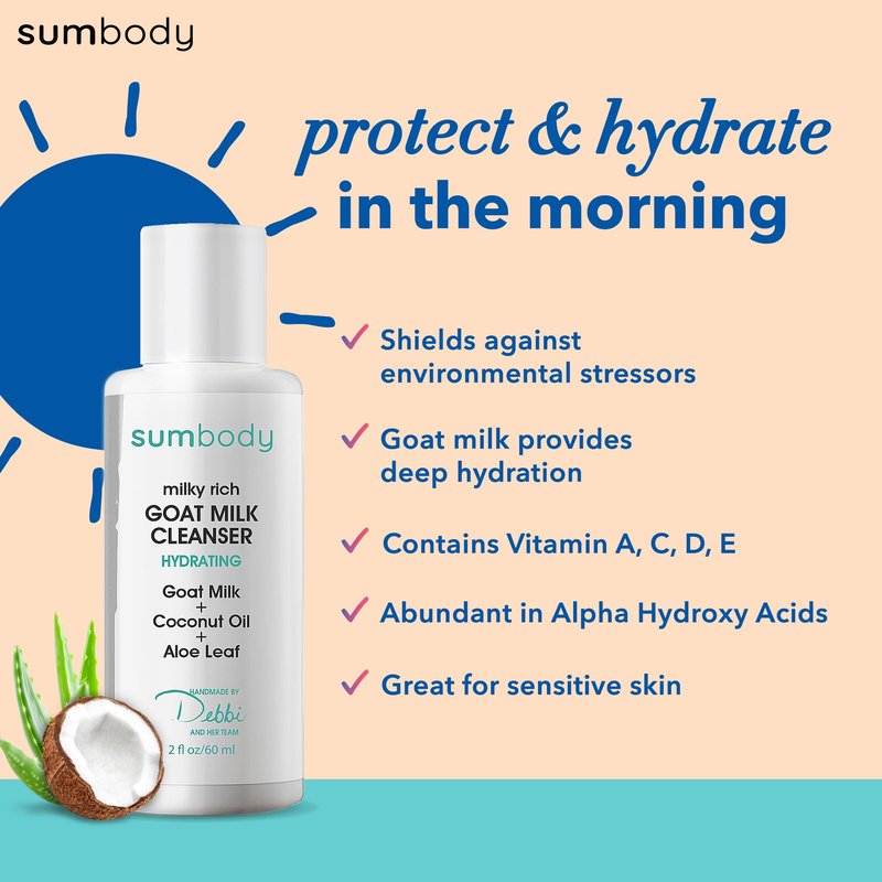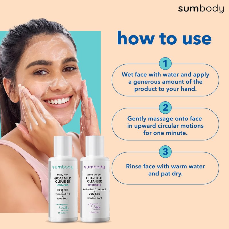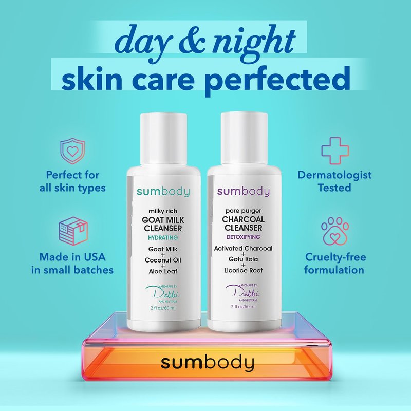 Sumbody's innovative Day & Night Cleanser Duo, tailored for specific skincare needs. Begin your day with our Goat Milk Face Cleanser, a gentle effective formula enriched with Alpha-Hydroxy Acids (AHAs) for gentle exfoliation & collagen boost. Crafted by a cosmetic chemist, esthetician & herbalist in small batches in the USA, this luxurious cleanser combines the soothing properties of chamomile, witch hazel & aloe vera to provide a calming & nourishing cleanse. Perfect for sensitive skin, it imparts essential nutrients like Vitamin A, C, and D & maintains optimal pH balance, leaving skin velvety smooth & well-hydrated. As the day turns tonight, embrace the purifying power of our Deep Pore Detoxifying Charcoal Cleanser. Made in America with care and expertise, this cleanser harnesses the potency of activated bamboo & coconut hull charcoals to pull out toxins, impurities & oils from congested pores. Infused with licorice root, it visibly reduces irritation & inflammation, while Tea tree & rosemary work synergistically to combat breakouts, minimize pore size & tighten. Its toxin-free formulation ensures a deep and effective cleanse without compromising the skin’s natural balance, promoting a clear, youthful complexion. At Sumbody, we've been dedicated to crafting quality skincare products for over 25 years, prioritizing proven efficacy over passing ingredient fads. Our commitment to sustainability shines in every aspect of our products, from formulation to packaging. Made in USA with care & love, our small-batch, toxin & cruelty-free formulations ensure that you receive only the best. Experience the difference with Sumbody, where quality meets conscience. Our skincare on the go travel-size cleansers, ideal for jetsetters, gym-goers & busy bees. Whether you're flying high or hustling on the ground, our compact cleansers ensure radiant & nourished skin anywhere, anytime. Also perfect for home care as skin needs change throughout the day ensuring you get what skin needs.