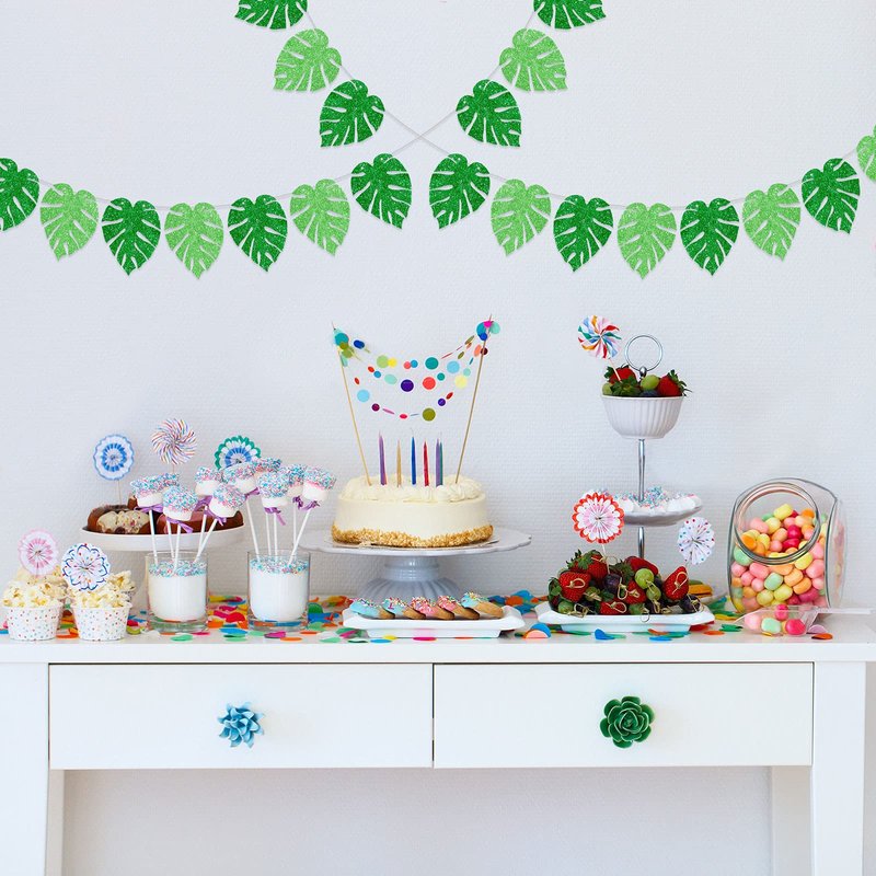 - Attractive decoration: each glitter tropical palm leaves banner is made up of palm leaves in dark green and light green, the overall color scheme is harmonious, which bring your a nice visual effect; You can hang it from branches, ceilings, wall, dessert tables, etc., and create a active summery atmosphere