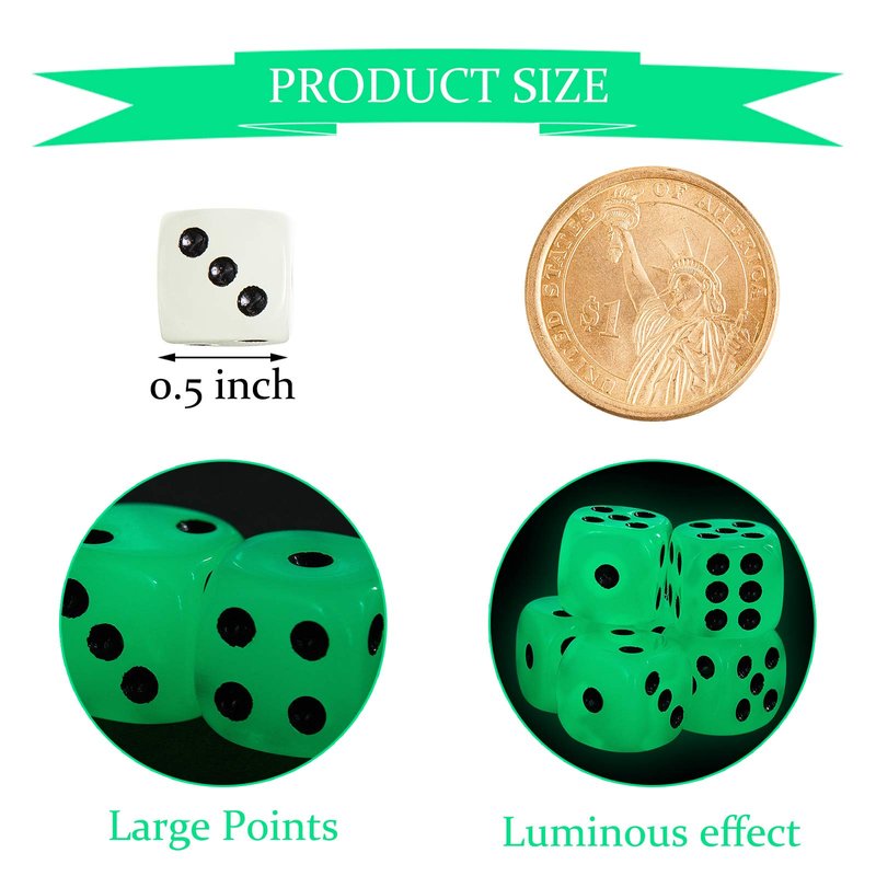 54 Pieces glow in the dark dice luminous dice 6 sided dice with black velvet pouches for board games activity casino theme party favors Luminous principle Generally, if the dice completely absorb the light energy, they can keep emitting light for 2-3 hours in the dark; When the energy is exhausted, they can light up again by repeatedly absorbing energy. Specifications: Material: acrylic and phosphor Size: 1.4 x 1.4 x 1.4 cm Color: as the picture shown Package include: 54 x Luminous dice Warm notes: Manual measurement, please allow slight errors on size. The colors may exist slight difference due to different screens. Small items, adult supervision is needed.