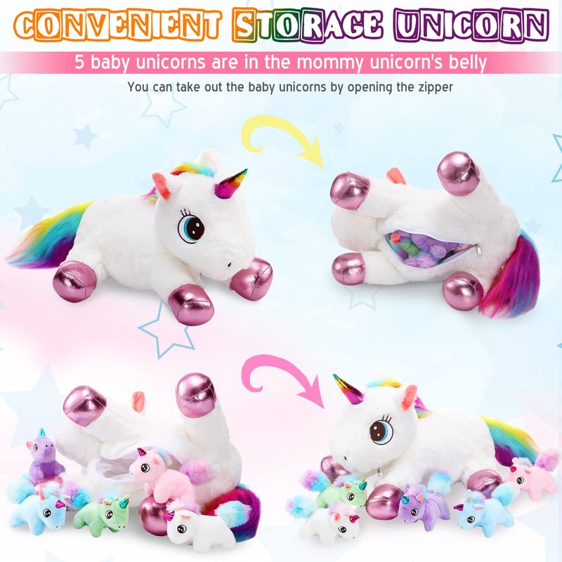 - 6 Toys in one package: the package contains 6 pieces of unicorn toys in total, including 1 piece of large unicorn and 5 pieces of plush unicorns; The 5 mini unicorns are in the mommy unicorn's belly, and you can take out the unicorns by opening the zipper, what a funny design. WARM NOTE: the plush toy will be squeezed after vacuum packaging, and it can be restored by treating it slightly with water vapor sprayed from the garment ironing machine.
