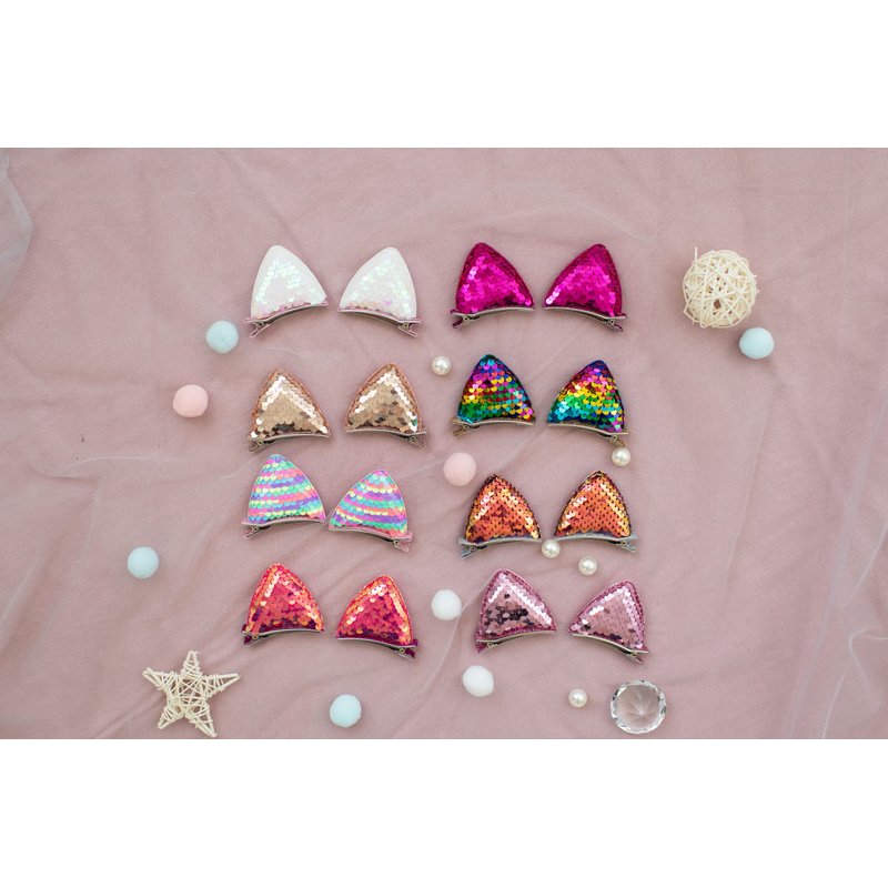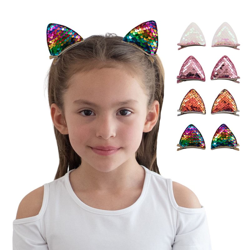 Summer Crystal 4 Pairs Sequins Cat Ears Kitty Ears Hair Clips - For Girls and Women - Stylish Hair Accessory for Birthdays, Costumes, Halloween, Holidays, and Parties (4Pairs BFFP)