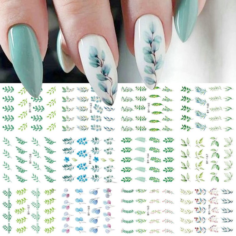 Summer Nail Art Sticker Green Leaf Nail Sticker Decal Green Blue Floral Flower Summer Nail Design for Acrylic Nail-Nail Art Supplies Manicure Decor 12sheets (green)
