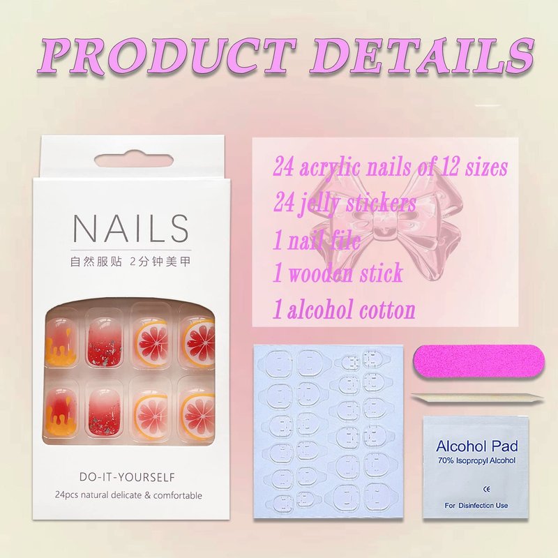 - 【Package Content】You will get 24 acrylic nails of 12 sizes, 1 nail file, 24 jelly stickers, and 1 wooden stick for removing false nails.