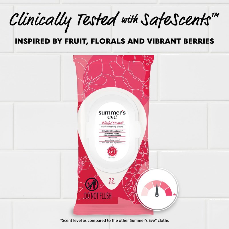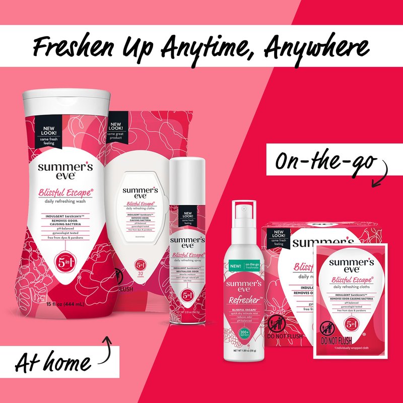 - Summer’s Eve Blissful Escape Daily Refreshing Feminine Wipes removes odor-causing bacteria