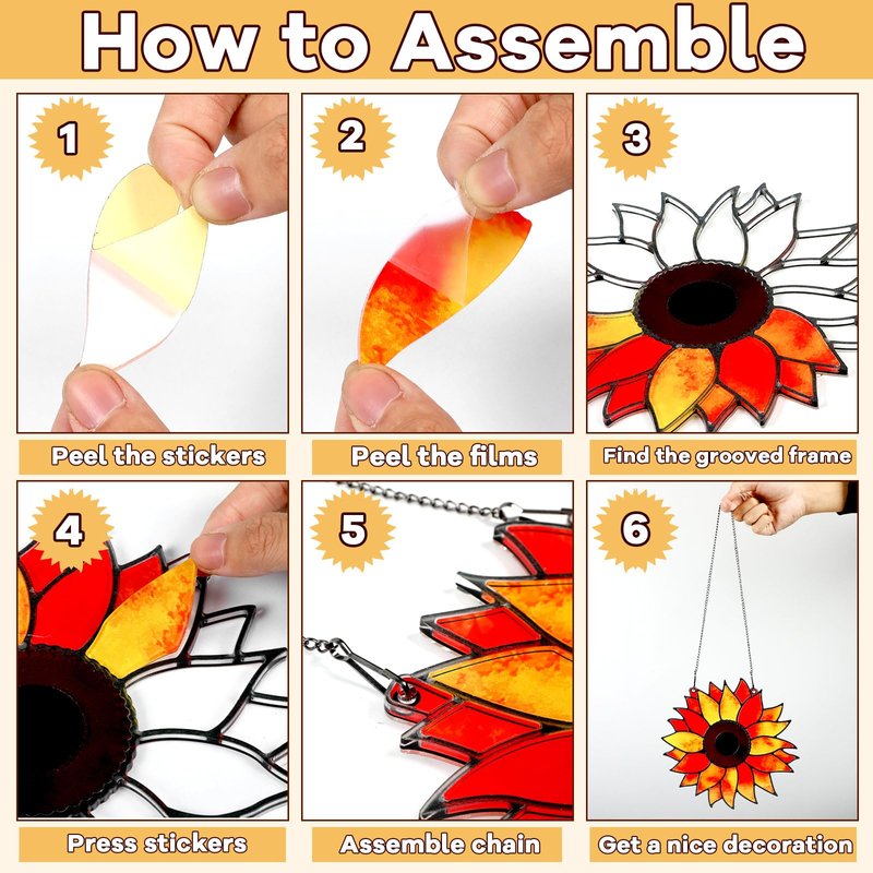 - 【What You'll Get】Each sunflower glass made easy activity kit comes with one sunflower board, chains and multiple stained glass sticker, along with a complete effect picture for you to assemble your sunflower stained glass craft. Simply remove the stickers and press them onto the grooved frame of the colored glass piece to satisfy your DIY needs.