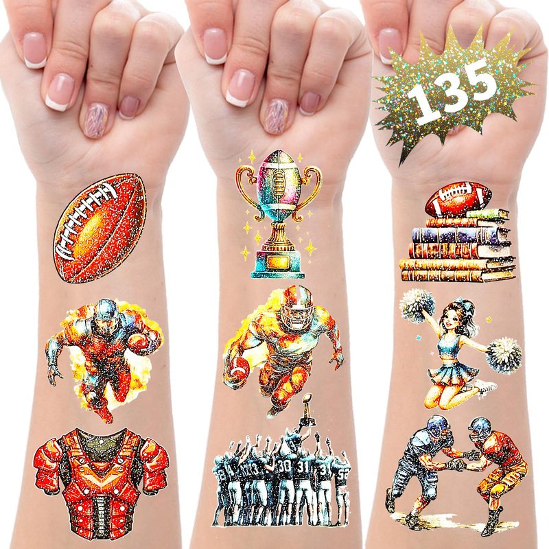- 135Pcs Glitter Style Football Temporary Tattoos for Kids: This set includes 135Pcs temporary tattoos in a glitter style, perfect for adding some football fun to any kids' party or event.