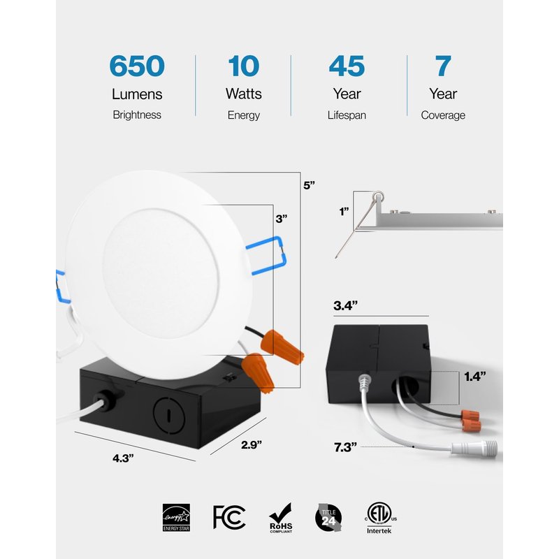 - ✅ SIMPLE INSTALL - Our LED slim downlights come equipped with a junction box which means they do not need a can. This 4-inch Wafer Thin Slim installs fast. Cut a hole in the ceiling to size then fold the spring-loaded brackets in while pushing up into the hole. Spring-loaded brackets fit any ceiling type: double drywall, single drywall, and soffit.