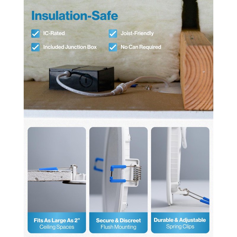 - ✅ IC RATED - Sunco's slim downlights are IC rated, meaning they are thermally protected and won't overheat or ignite surrounding insulation in the roof or overhead joist space. Both the light and its junction box are safe for direct contact with ceiling insulation.
