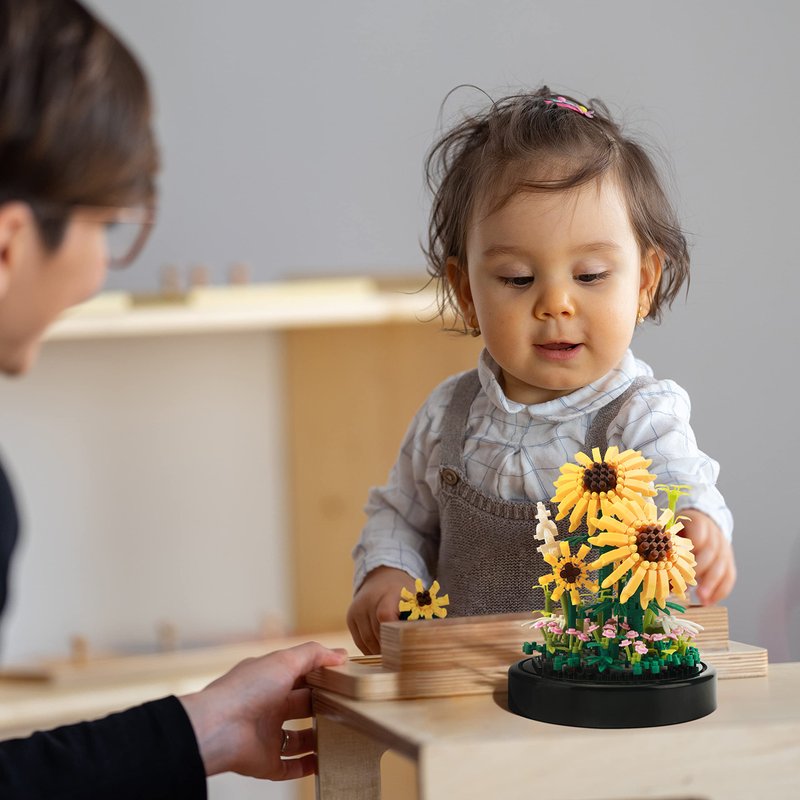 - A Forever Blooming Sunflower: This realistic sunflower-themed building block flower set will never wither or fade. It comes with a protective dust cover and sturdy base to keep it safe and clean for long-lasting beauty