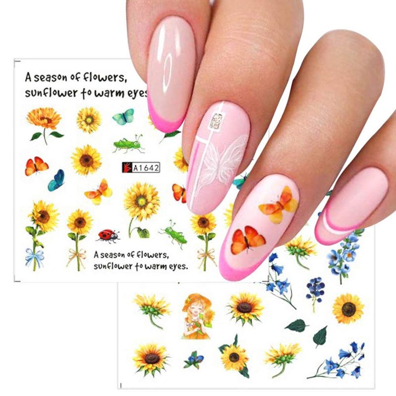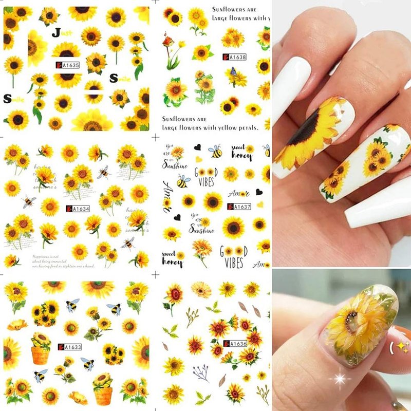 The set of items include 12 sheets Sunflowers flower nail art stickers. Perfect for nail decoration in spring and summer.