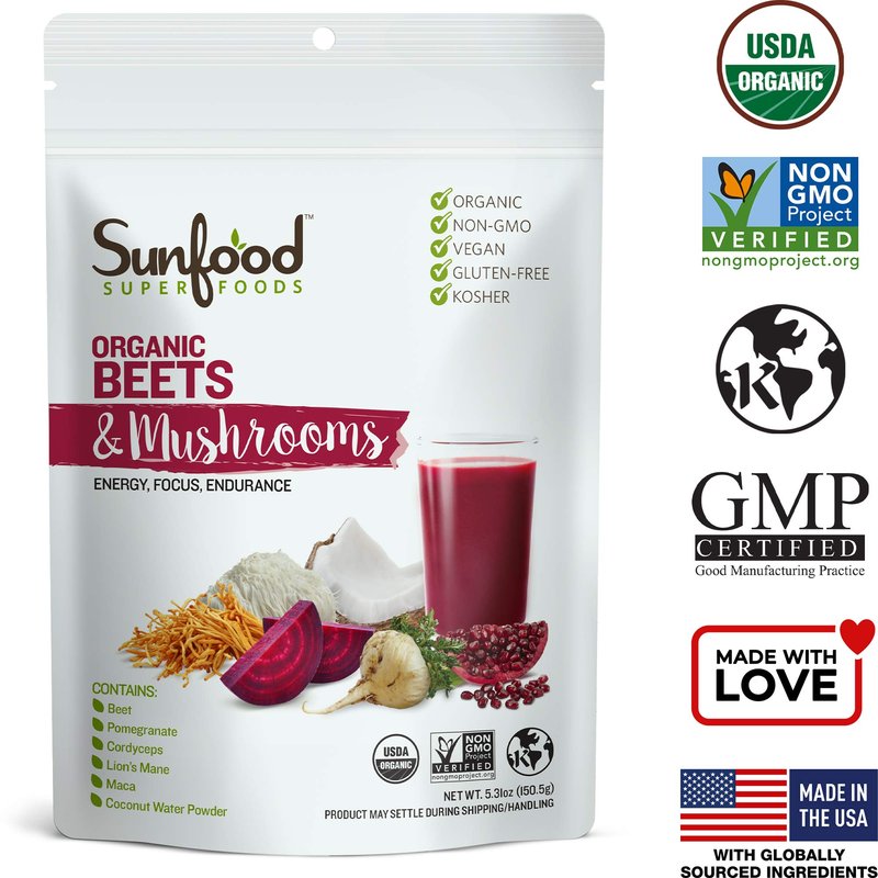 Sunfood Superfoods Organic Beets & Mushrooms Blend with Beetroots, Pomegranate, Cordyceps, & More | 5.31 oz Bag, 10 Servings | Plant-Based Powder Drink Mix | Boost Energy