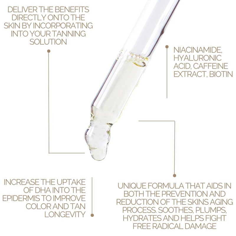 A unique formula that aids in both the prevention and reduction of the skins aging process. Soothes, plumps, hydrates and helps fight free radical damage. We know you love our All Natural/Organic Spray Tanning Solution. Now you can easily create a tanning solution that includes powerful anti-aging ingredients such as: Niacinamide Hyaluronic Acid Caffeine Extract Biotin