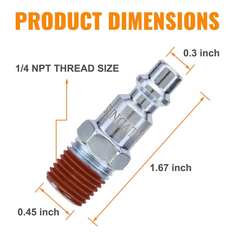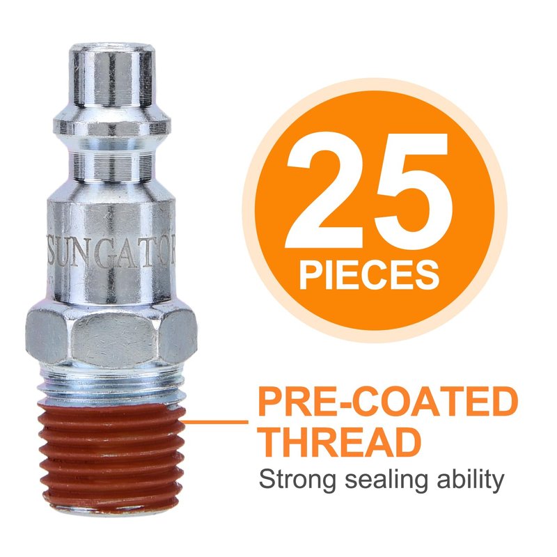 - 【WIDE APPLICATION】: SUNGATOR 1/4'' male industrial air plugs are adapts to industrial I/M/D type air couplers, air quick connectors. These are widely applied to professional jobsites, automotive shop, auto dealership service department, in home, in the garage for air hose, air compressor, air tools, air nailer, air blow gun, pressure washer, etc.