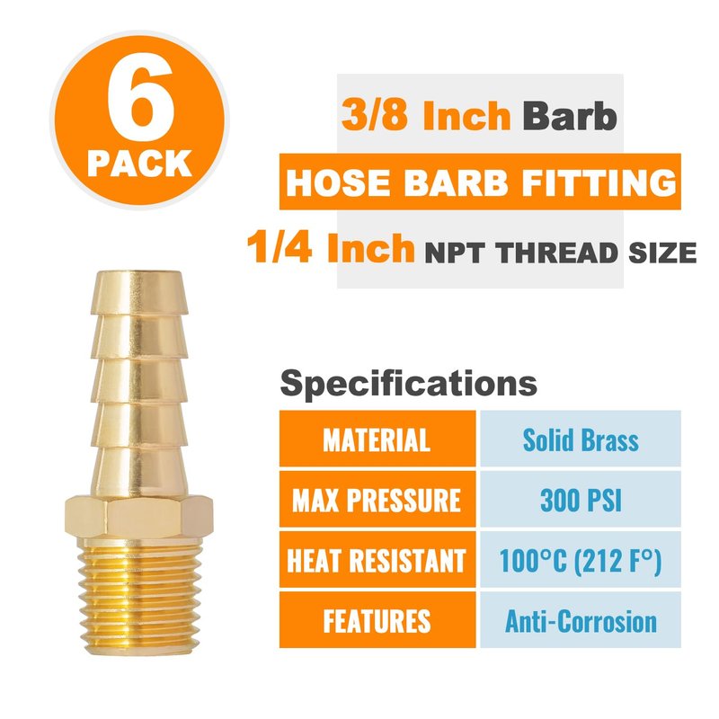 - 【PREMIUM MATERIAL】: High quality solid brass, firm and durable, providing high resistance to abrasion and corrosion, 3/8”barb X 1/4”NPT male pipe, 6 pack
