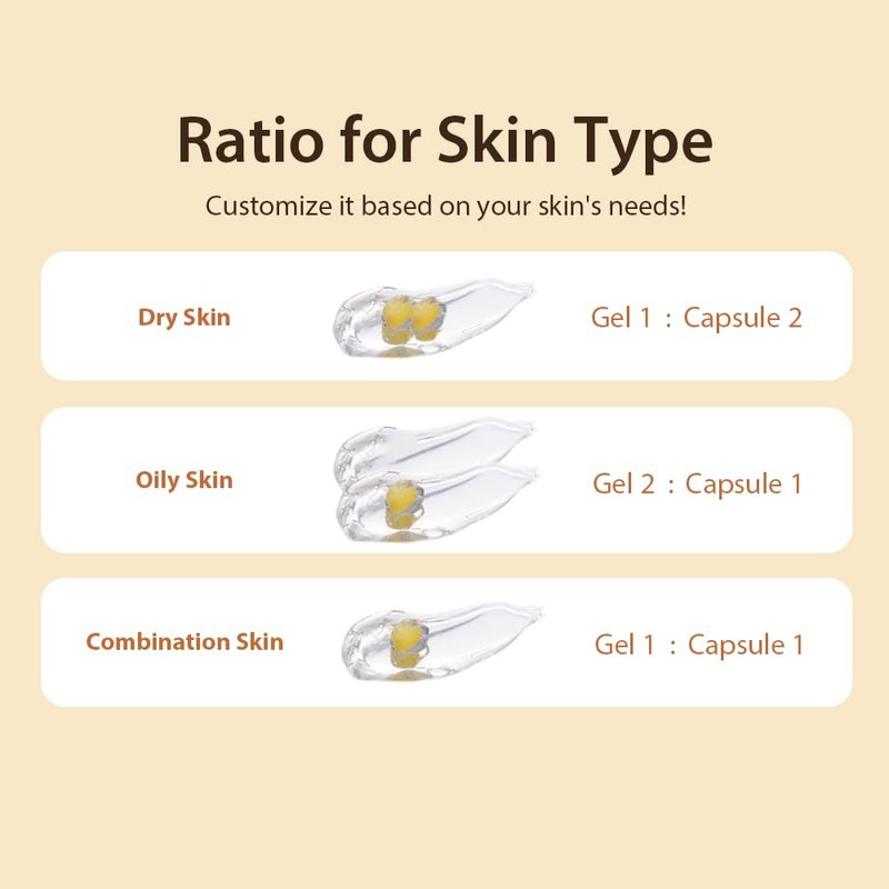 - [CUSTOMIZABLE FORMULA FOR ALL SKIN TYPES] Tailor your skincare experience with adjustable capsule-to-gel ratios to suit your skin type. (*Capsule-to-Gel Ratio : For dry skin, use a 2:1 ratio; for normal skin, a 1:1 ratio; and for oily skin, a 1:2 ratio.) This versatility ensures optimal care for any skin type.