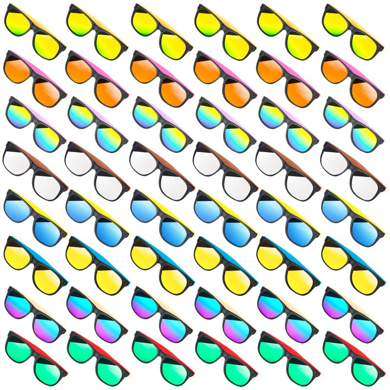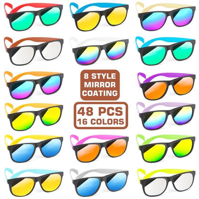 - Reflective Design: There are 48 pack Sunglasses with 16 Neon assorted colors plastic frame and 8 style mirror coating, comes in red, yellow, orange, blue, green, pink and etc! Perfect for Vintage 80's Retro Party Favors