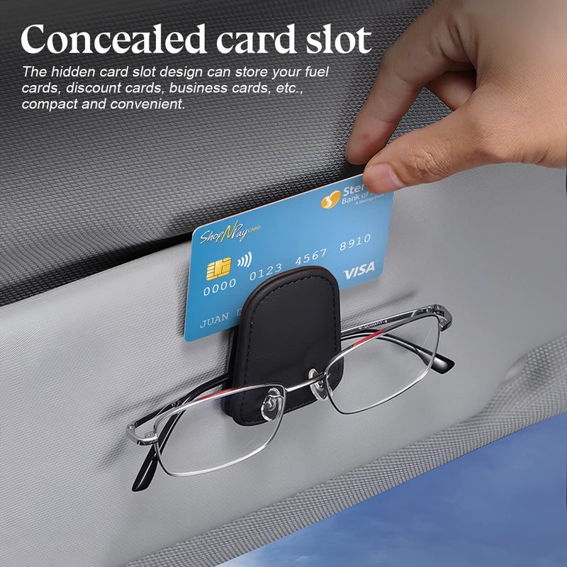 - 【High Quality & Durable Material】: This glasses holder made of high grade leather material, the car visor sunglasses holder is more textured and durable. The cowhide contains magnets, which can be attracted to stabilize the glasses without damaging the temples of the sunglasses, the classic design complements your car's interior look.