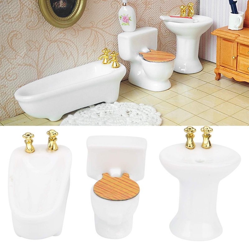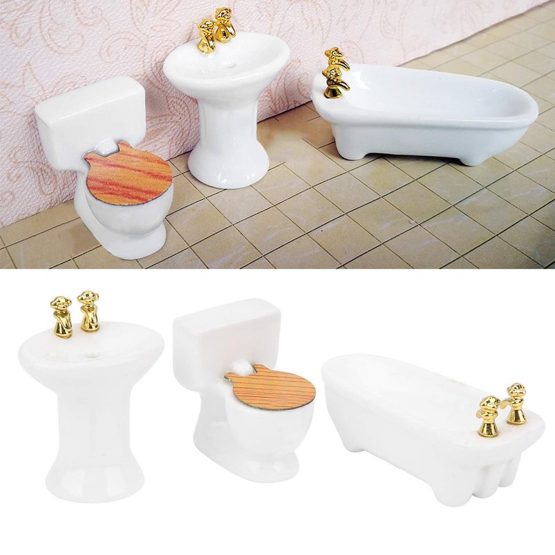 SUNGOOYUE 1/24 Dollhouse Bathroom Set, Mini High Simulation Ceramic Bathtub Toilet Sink Kit for DIY Dollhouse Accessory(#1)