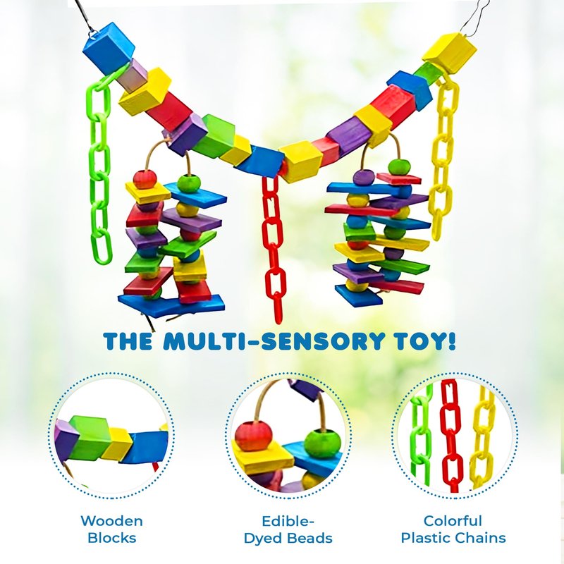- No Worry Nibbling --- As a conscious maker of pet products, we use raw materials that do not pose any impact on your pet. Even in this product, edible food coloring has been used to give the wooden blocks their brilliant color that birds love so your pet can nibble and chew on this toy without giving it a second thought.
