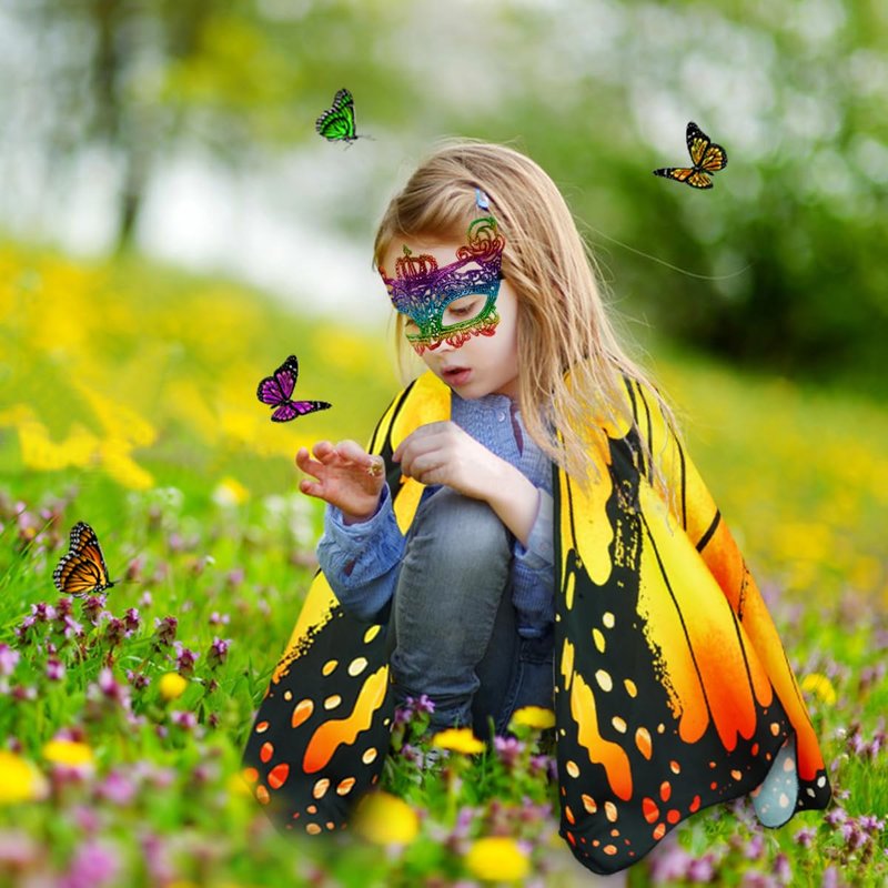 - 【Easy To Wear Take off Store】:This girls butterfly costumes is lightweight, takes up little space and fits easily in your bag. As dress up dresses and butterfly wings toddler are easy to put on and take off, Just attach the elastic band, then wrap the loops around your fingers, put on the mask and gently wave your arms, the soft butterfly cape will fly up like butterfly wings, making you look like a beautiful butterfly fairy. You can swing freely like a butterfly for an immersive effect.