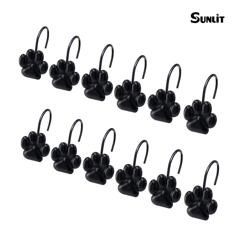 Sunlit Fashion Design Cute Paw Print Polished Shower Curtain Hooks for Dog Cat and Bear, Rust Proof Oil Metal Shower Curtain Rings, Black-12 Pack