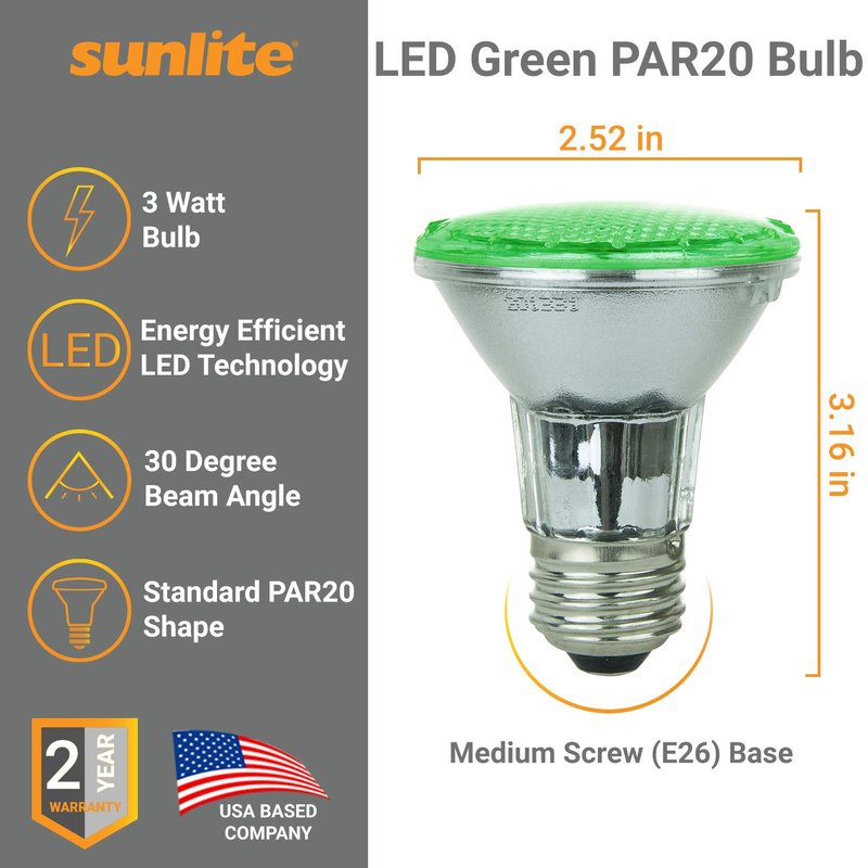 Sunlite 80002-SU LED PAR20 Colored Light Bulb, 3 Watts, (25W Equivalent), E26 Medium Base, 30,000 Hour Lifespan, 1 Pack Green