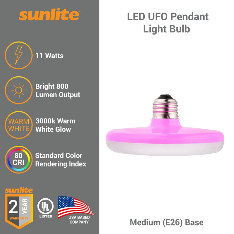 Sunlite UFO Pendant Fixture LED Light Bulb, 11 Watt, (50W Equivalent), 800 Lumens, Medium (E26) Base, Pink Housing, 30K-Warm White