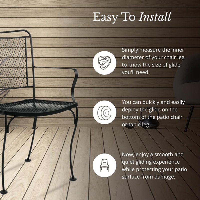 Protect your floor and prevent screeching noise while moving your furniture here and there with our deluxe Wrought Iron Chair Glides, made with heavy-duty plastic and a wrought iron frame. Designed to fit a 1-1/2" inside diameter cup, these chair leg floor protectors allow you to enjoy and relax on your outdoor furniture without worrying about damaging patio furniture and flooring. These floor protector chair glides are available in both white and black colors and are incredibly easy to install. Before ordering these chair glides, make sure to correctly measure the inner diameter of the furniture's cup. The round furniture sliders protect your patio furniture and floor against harsh scratches and damage with our wrought iron chair leg floor protectors. Built to last longer, our sturdy and premium chair leg caps are a must-have for your patio floor.