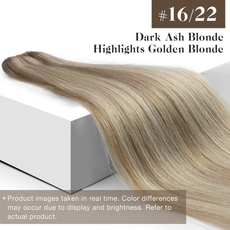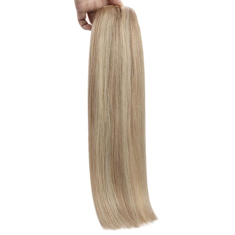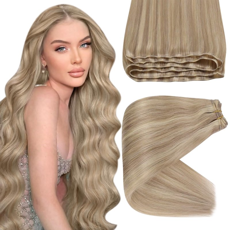 Sunny Human Hair Weft Highlights Hair Extensions Real Human Hair Sew in Blonde Highlight Weft Hair Extensions Human Hair Dark Ash Blonde Highlighted Golden Blonde Sew in Human Hair Bundle 70g 14inch