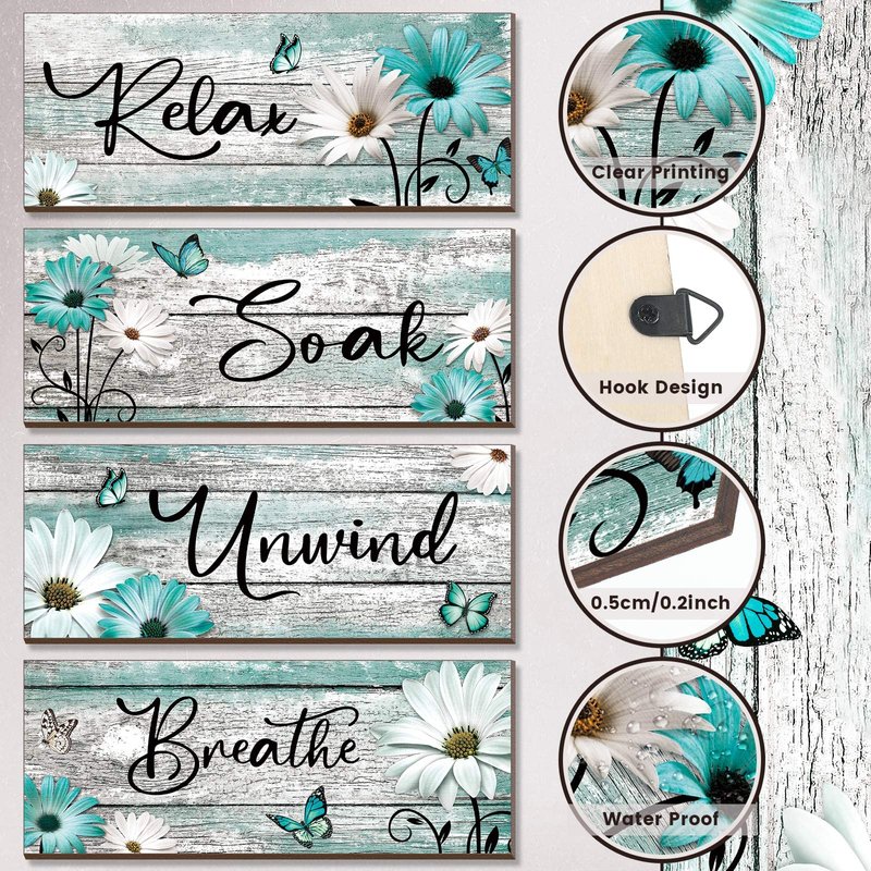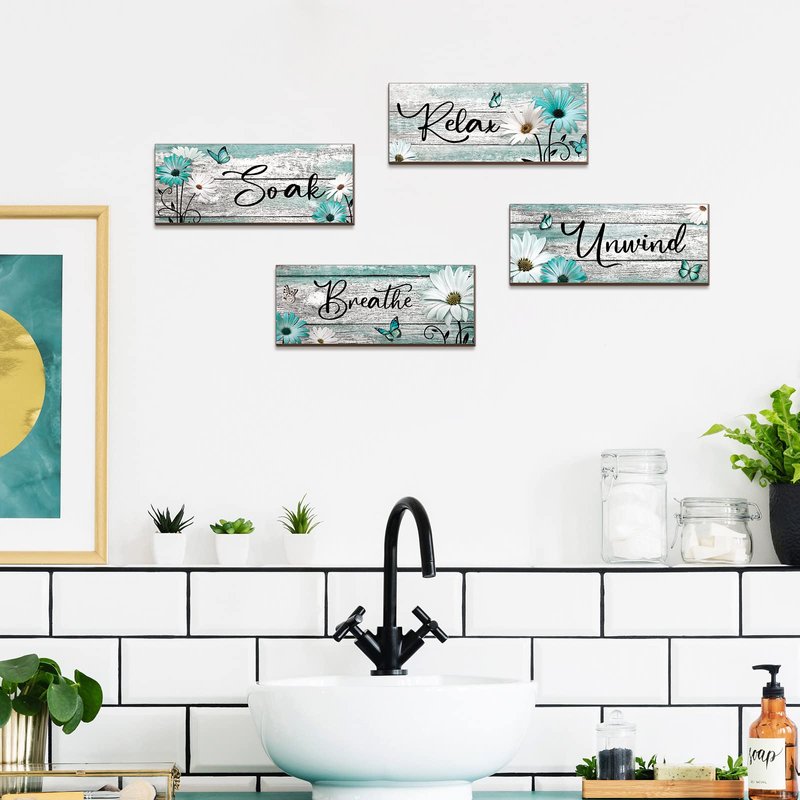 Sunnyray 4 Pcs Farmhouse Spring Bathroom Wall Decor Sign Daisy Tulip Flowers and Butterfly Bathroom Wall Art Relax Soak Unwind Breathe Rustic Wood Plaque Spring Decor(Turquoise, 10 x 4 Inch)