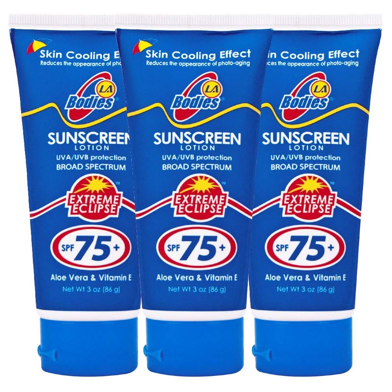 Sunscreen Moisturizing Face & Body Lotion (SPF 75) w/Aloe Vera for Cooling Sensation | LA BODIES | For Acne Prone Skin | Quick Absorption | UVA UVB Protection Sunblock | 3oz | 3 Pack