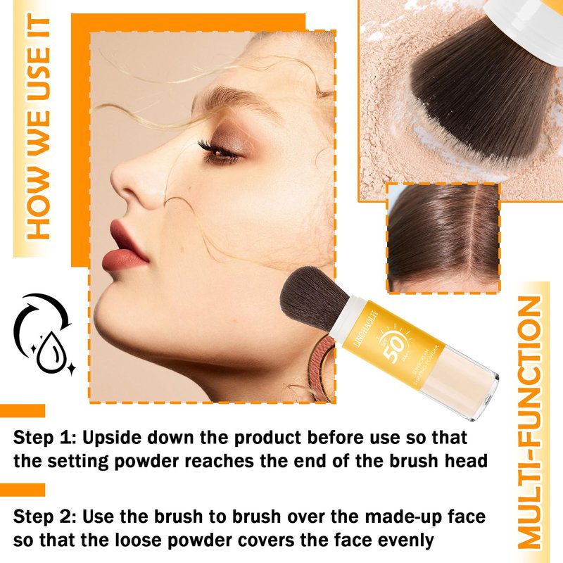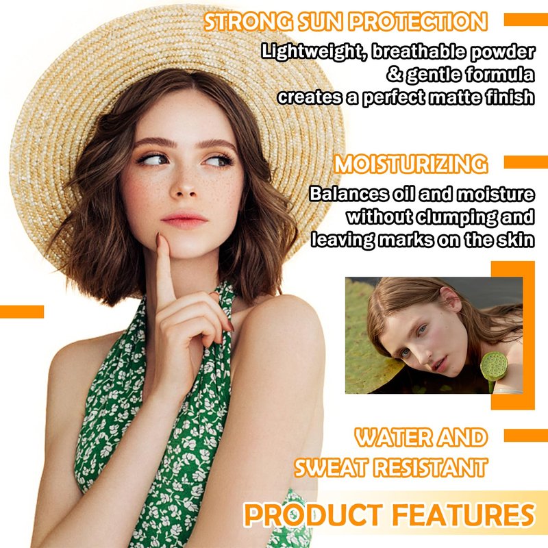 - š¹ćLightweight and BreathablećBrush on sunscreen powder has a fine texture, does not float, does not get stuck in the powder, is not easy to caking, can be closely adhered to the skin,easily keeps makeup looking natural and long-lasting.
