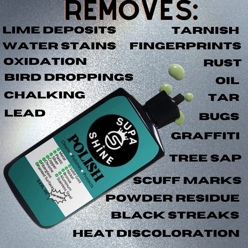 • Looking for a product that cleans, polishes, and protects nearly every type of surface in your car, kitchen, garage and bathroom? If so Supa Shine is your all in one bottle of: metal cleaner, brass polish, aluminum cleaner, copper cleaner and more!