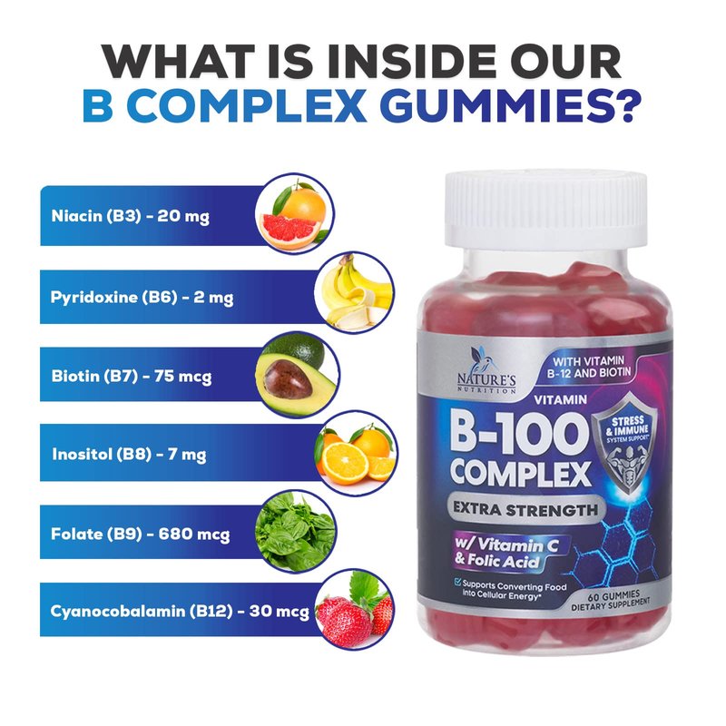 - Extra Strength 6 B Vitamin Complex: Our Nature's Nutrition B Complex Gummies contain 6 essential B vitamins; Niacin, B6, Folic Acid, B12, Biotin & Pantothenic Acid