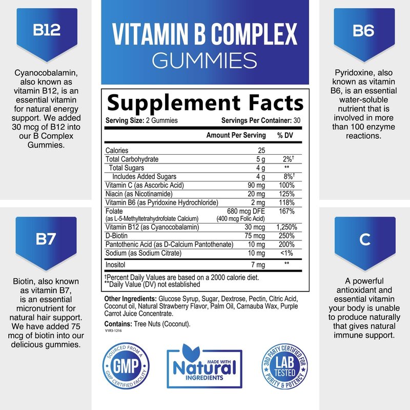 - Trusted Formula: Our Vitamin B Complex is formulated and manufactured following strict cGMP guidelines; Our B Complex Gummies are third party tested to assure the quality and purity of each batch