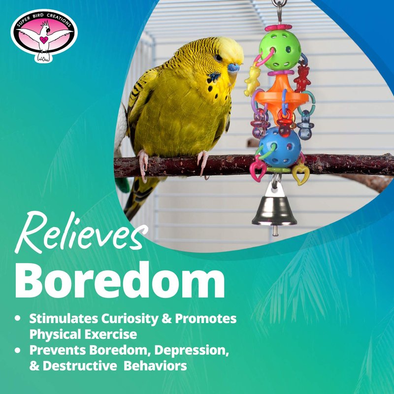 - IDEAL FOR SMALL TO MEDIUM BIRDS: Super Bird Creations' Binky Bop is tailored for Parrotlets, Parakeets, Cockatiels, Lovebirds, Ringnecks, Medium Conures, Quakers, Caiques, Pionus, Senegals and similar sizes, offering the perfect interactive bird toy experience for your feathered friends.