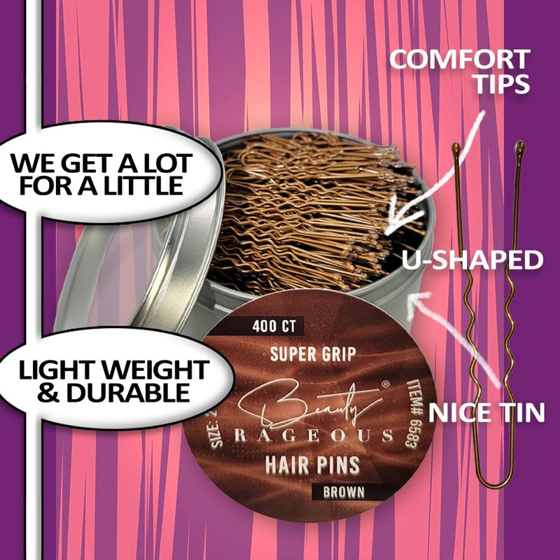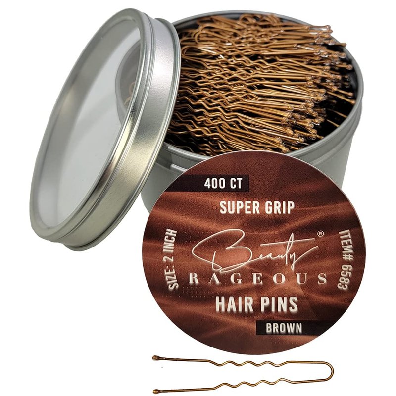 Super Grip U-Shaped Hair Pins - 400 Ct Approx - Handy Reusable Tin (Brown)