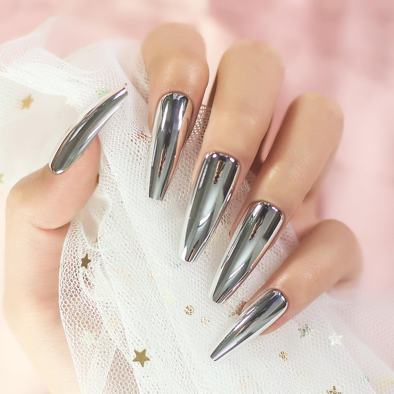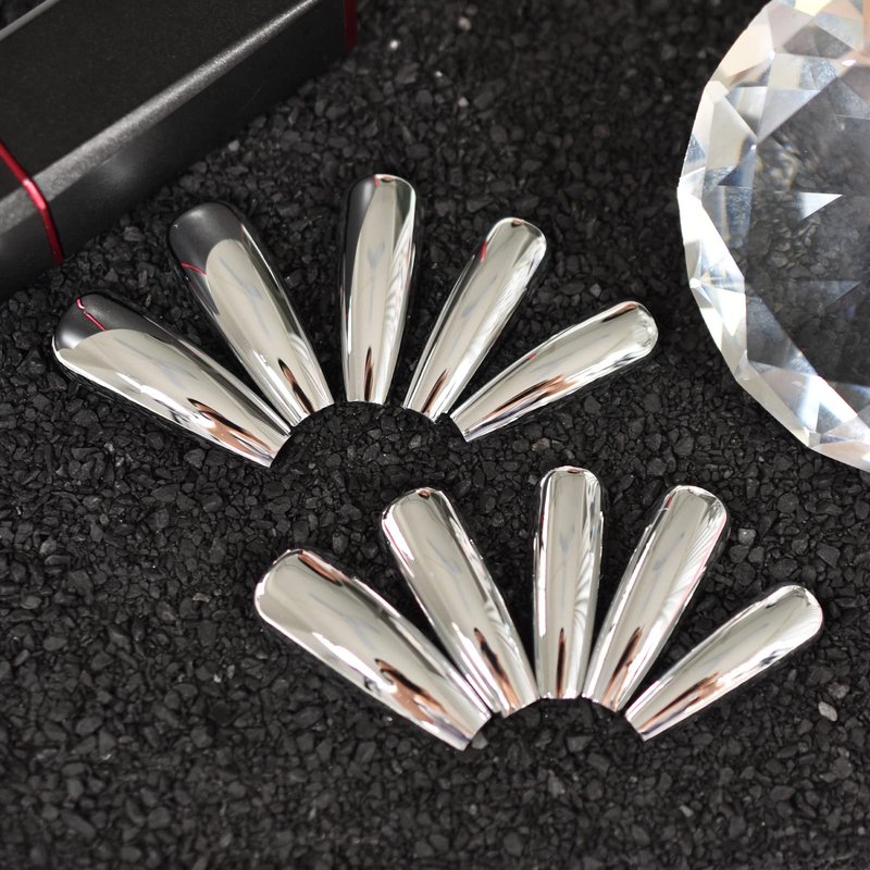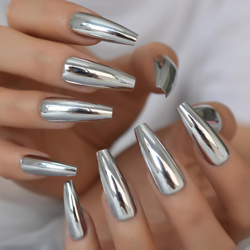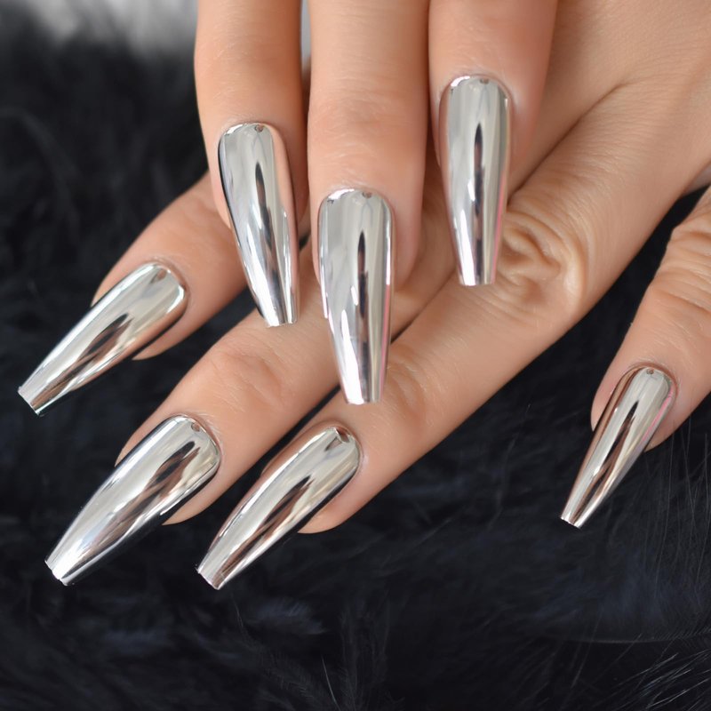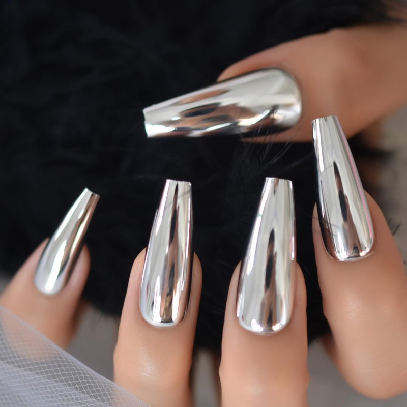 • 1. About the nails- Coffin Ballerina Press on Nails, Reflective Mirror Shiny Metallic Silver Fake False Nails, Super Long Punk Style, make you more charming.