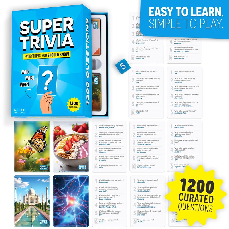 - Exciting Trivia Game - Super Trivia is super exciting to play and educational at the same time. Questions are thoroughly picked so they are not too hard or too easy. 1200 Trivia Questions for countless hours of Game Night Fun!