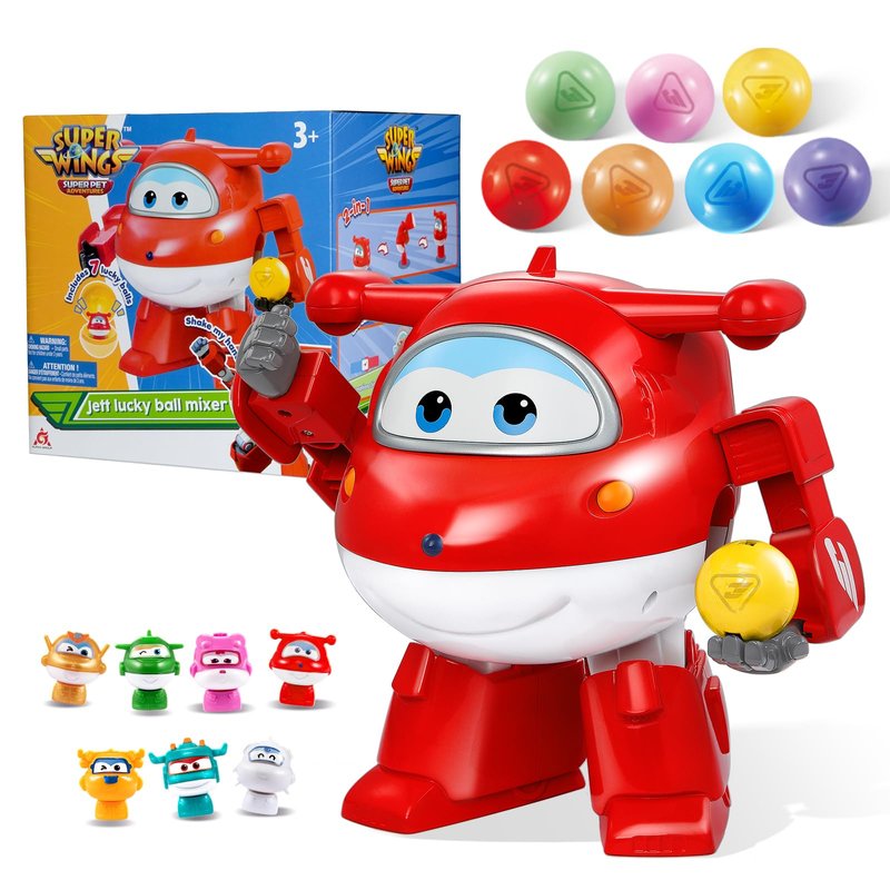 Super Wings Toy Vending Machine for Kids, Mini Gumball Machine Gashapon Machine with Colorful Balls & Role Dolls & DIY Stickers, Cause and Effect Toys for Boys Girls, Jett Lucky Ball Mixer