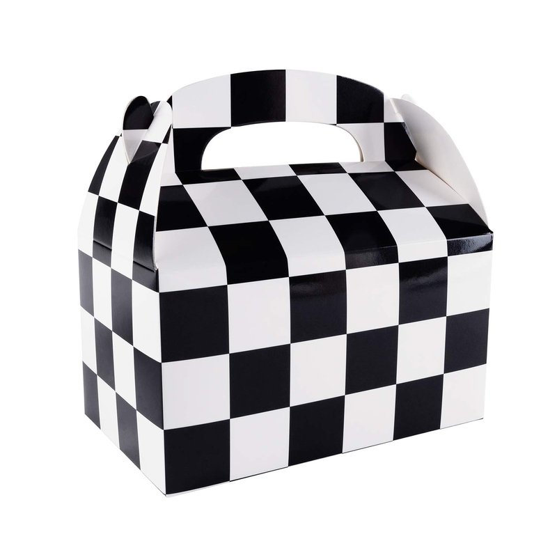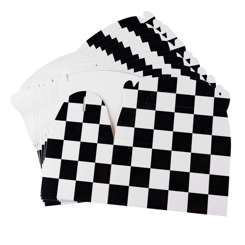 - Fill up these black and white checkered race track treat boxes with favors for your guests at your next birthday party or any other event. Easily to match them with carnival decorations, celebrate with pinatas for birthday party, add birthday party balloons and kids party favors. The possibilities are endless as you can suit the paper boxes to your needs.